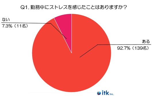 勤務中にストレスを感じたことがあると回答した人が92.7%(139名)と多数を占めており、一方で、ストレスを感じたことがないと回答した人は7.3%(11名)にとどまっています。