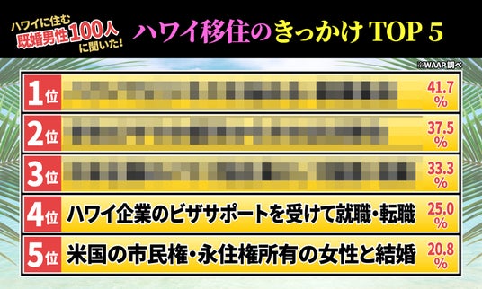 - 「ハワイ移住のきっかけTOP5」「仕事の業種ランキングTOP10」などの移住の実態
