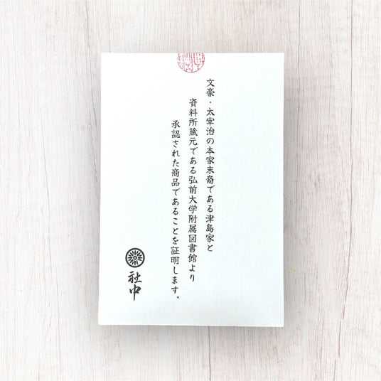 これは太宰治の末裔である津島家(本家)と、ノートを所蔵している弘前大学附属図書館からの販売許可を正式に取得し、商品一つ一つに社中の商品である証明書が付属します。※名刺サイズの証明書です。