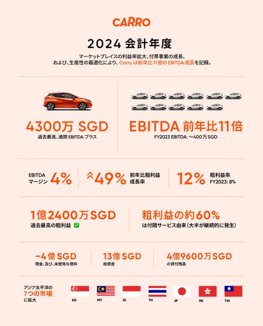 シンガポール、2024年12月4日 - カーロテック株式会社の本社であり、アジア太平洋地域最大級かつ最も急成長しているオンライン中古車プラットフォーム・Carroは、監査済みFY2024の額として、EBITDA 4300万シンガポールドル(3200万米ドル)、EBITDAマージン4%を達成し、力強く一年を締めくくることとなりました。