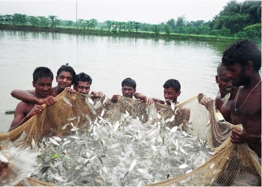 写真:重機を使わず300人で手掘りした養殖池でとれた魚たち