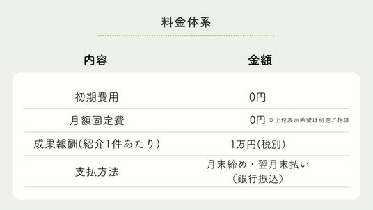 - 成約の有無にかかわらず「紹介1件=1万円」の明瞭な成果報酬型