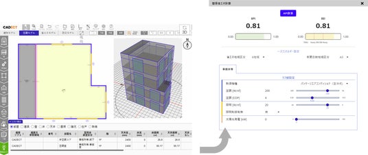 簡易空間モデル作図ツール「CADECT」にて作成した、簡易空間モデルの外皮情報に加え、空調負荷、照明、太陽光発電などの設備情報をシークバーで簡易的に設定し、省エネ性能のシミュレーションを行うアプリケーションです。WEBPROとのAPI連携により、BPI値およびBEI値の計算結果を取得し、確認することができます。