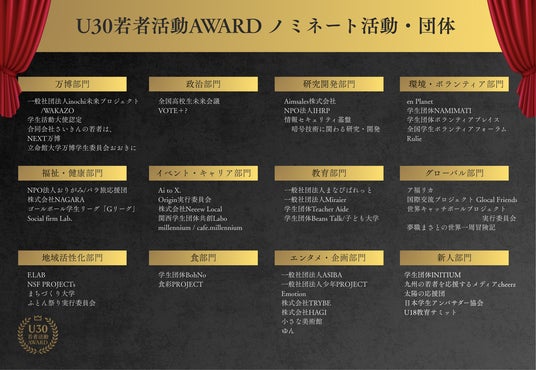 一般社団法人日本若者キャリア支援協会(所在地:東京都渋谷区、代表理事:岩崎聖奈、以下 JYC)は、2025年12月15日(月)、文京シビックセンター 小ホールにて「U30若者活動AWARD2025」表彰式を開催し、全国から選出されたノミネート50団体(12部門)の中から、各部門の最優秀賞・優秀賞および「2025若者活動大賞」を決定・発表いたしました。