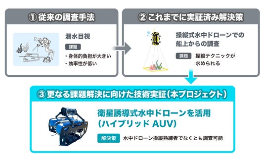BlueArchが2025年2月に特許を取得(※上述)した操縦式水中ドローンを使用して藻場を測定する方法は、高度な操縦技術が要求されるという課題がありました。そこで、本取り組みでは衛星誘導式水中ドローンを使った測定手法を実証実験します。