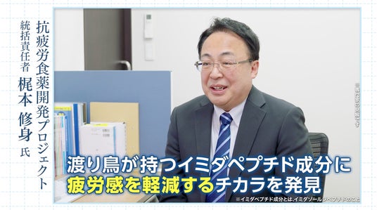 抗疲食薬開発プロジェクトリーダー・梶本修身。歴史上の偉人を支えたとされる栄養成分であり、渡り鳥の活力を維持するイミダゾールジペプチドを主成分とした疲労感軽減ドリンク「イミダペプチド」を開発した。