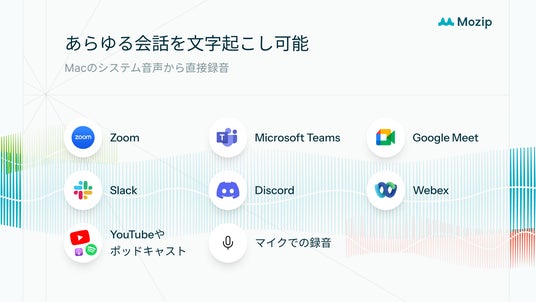 MozipはZoomやGoogle Meetなどにボットを入室させる必要がある他社製品と異なり、アプリでMacのシステム音声を直接収録することが可能です。