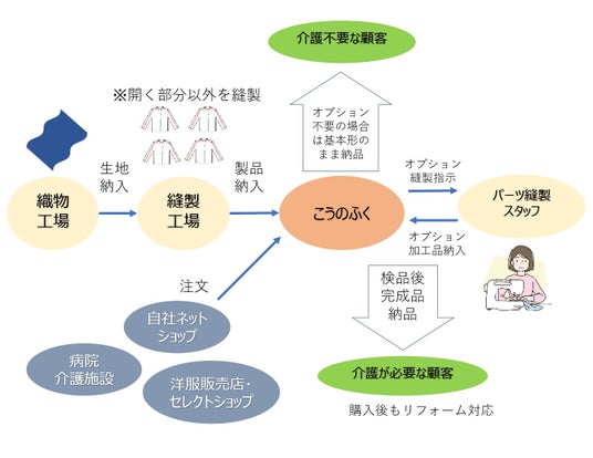 「こうのふく」は、代表自身の次男と父の介護経験から、着替えが困難な人にもファッション性のある衣類の必要性を感じ、2018年に創業。個々のニーズに合わせたカスタマイズに対応し、一人ひとりに寄り添ったサービスを展開してきました。