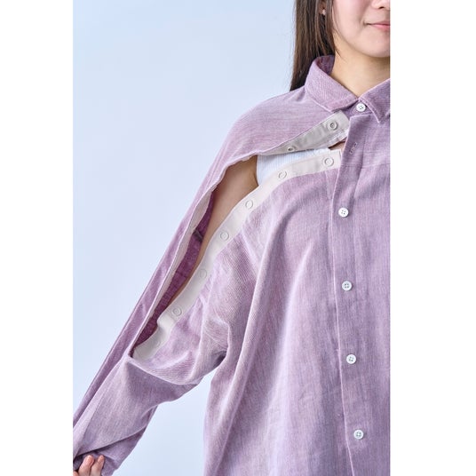 普通のシャツのような見た目ですが、ボタン留めが難しい人や点滴中でも着替えられる機能性が必要な方は、オプションでボタンをマグネットに変更したり、前たての第2ボタン下から袖口までを開いたり出来ます。