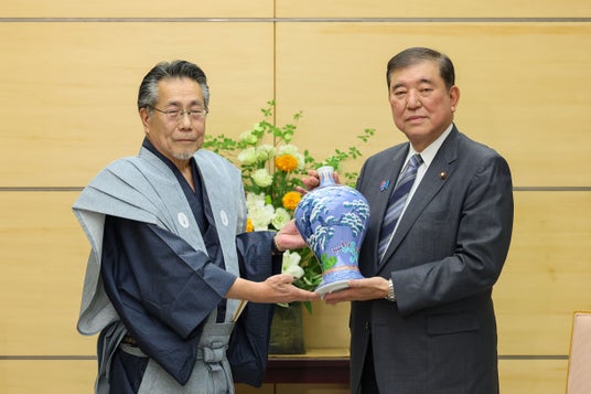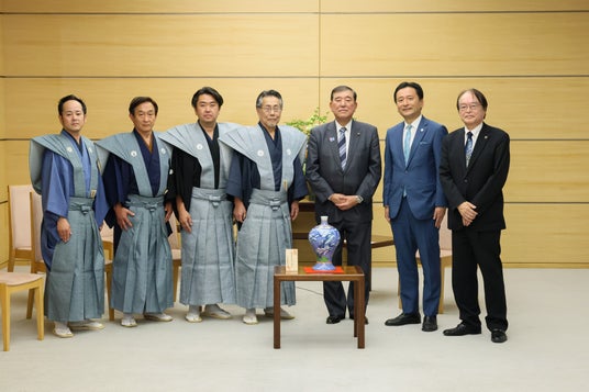 2025年5月27日(火)、鍋島焼開窯350周年を記念して、伊万里鍋島焼協同組合は総理大臣官邸を訪れ、石破内閣総理大臣へ鍋島焼の瓶子「瑠璃焼締松柏鳳凰文瓶子」を贈りました。