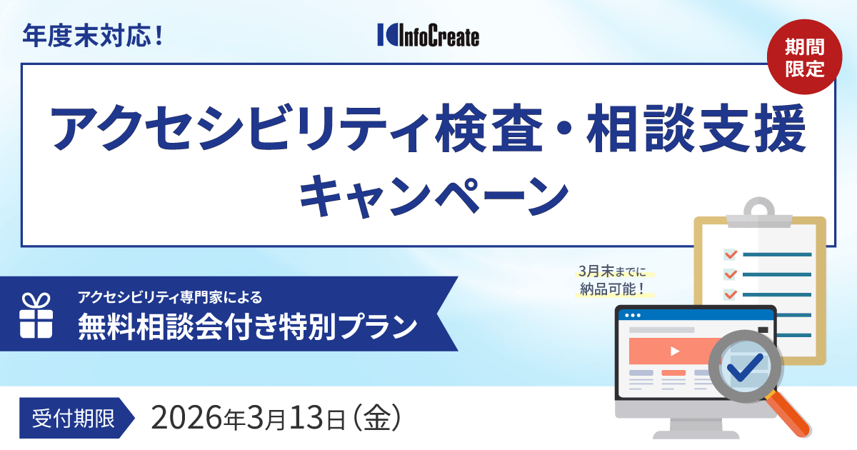 こうした状況を踏まえ、インフォ・クリエイツでは、Webアクセシビリティに関する2026年3月13日(金)受付分までの期間限定で、アクセシビリティ専門家による相談会が付いた特別キャンペーンを実施します。