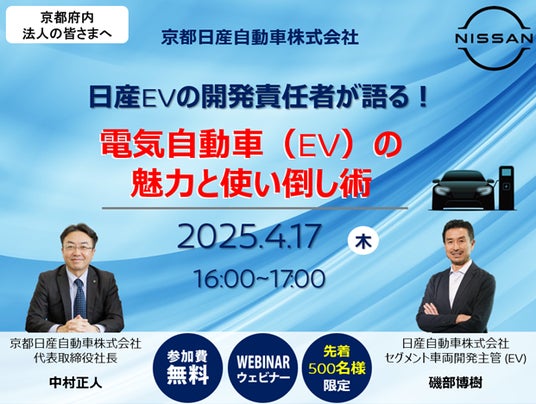 日産自動車(株)のEV全体の開発責任者である磯部氏を交えて、京都府内の法人・個人の皆さまにオンラインセミナー「日産EVの開発責任者が語る!電気自動車(EV)の魅力と使い倒し術」を開催することをお知らせします。