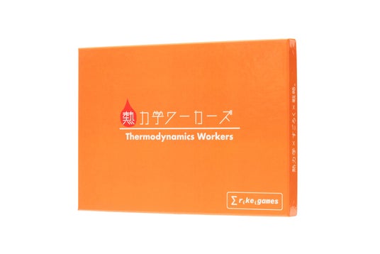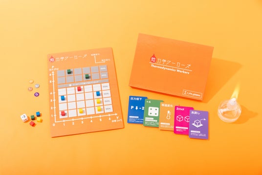 『熱力学ワーカーズ』は、熱力学のイメージを体感できるボードゲームです。熱力学で登場するP-Vグラフをゲームボードに見立て、プレイヤーはその上で気体を動かしてエネルギーを稼いでいきます。高校物理の重要分野である熱力学を、公式の暗記だけでなく体感的に学べるのが魅力。理系学生や教育関係者に高く評価され、企業の研修としても導入実績があります。大人数でも楽しめるエンタメ性を兼ね