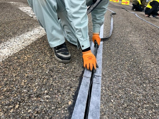 アスファルトに溝幅約20~30mmを切って差し込むだけの革新的な”縦入れ工法”を実現。