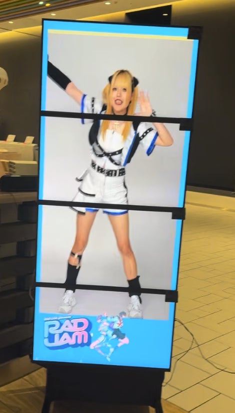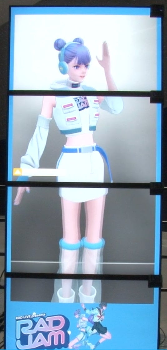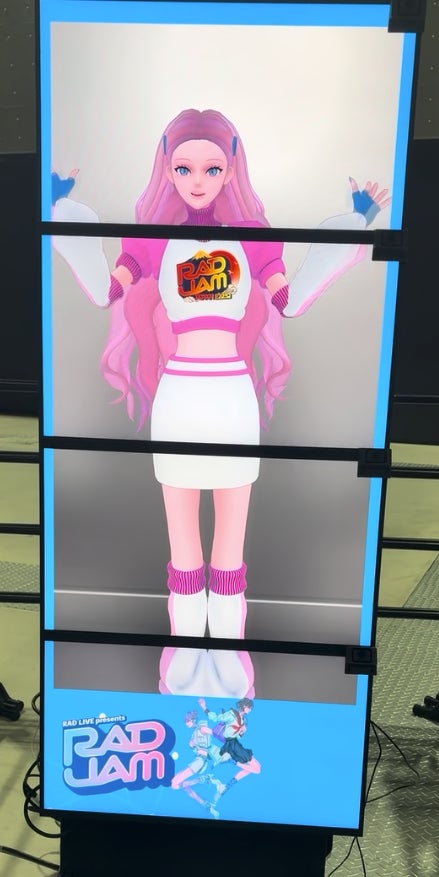 プロジェクト2:「3Dウェルカムメッセージ」会場入口には、SRD(ELF-SR2)を4台連結した等身大ディスプレイを設置。当日の出演グループによるウェルカムメッセージ(※1)を表示し、さらにRAD JAM公式アンバサダーとしてOXYTRONが開発した3Dアバター(※2)も登場。来場者への高い没入感とサプライズを演出しました。