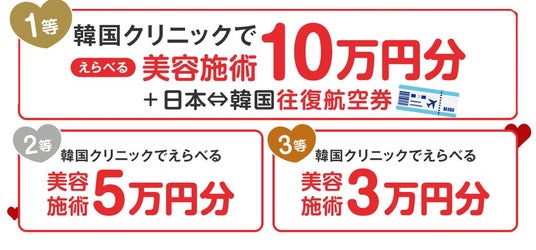 1等当選なら、航空券付きの韓国美容施術があたるので、現地滞在費用のみの負担で美容体験をご提供。