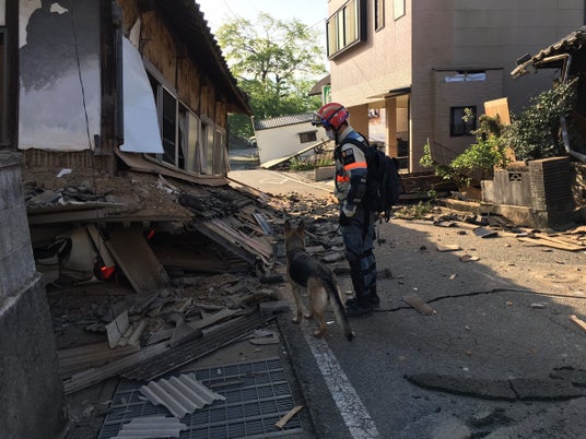 2016年に発生した熊本地震で捜索活動を行うスタッフと災害救助犬