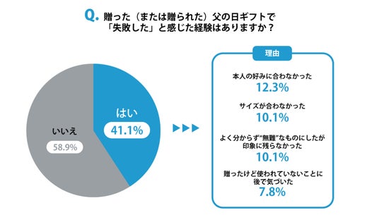 贈った(または贈られた)父の日ギフトについて、4割超(41.1%)が「失敗したと感じたことがある」と回答。
