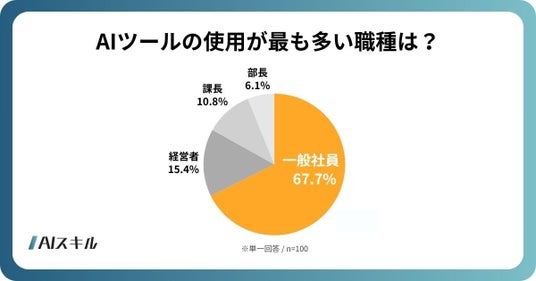 本調査の回答者のうち、ビジネス現場でAIツールを使用しているのが最も多かった職種は「一般社員」(67.7%)であり、次いで「経営者」(15.4%)、「課長」(10.8%)となりました。
