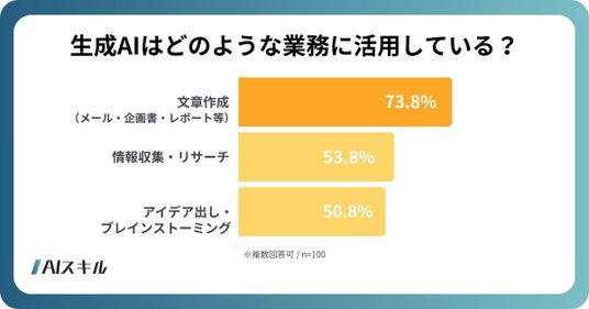 とくに、上司や社内へのメール、社内向けの企画書作成など、生成AIを日常業務の効率化に活用しているビジネスパーソンが多いようです。