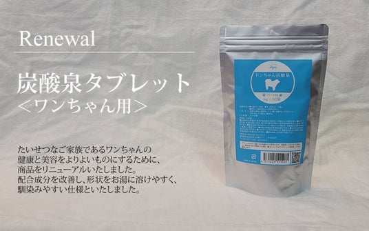 株式会社リラックスプランニング(東京都渋谷区)は、「わんちゃん用炭酸泉タブレット」をリニューアルして再販開始いたします。20錠入り、60錠入り。