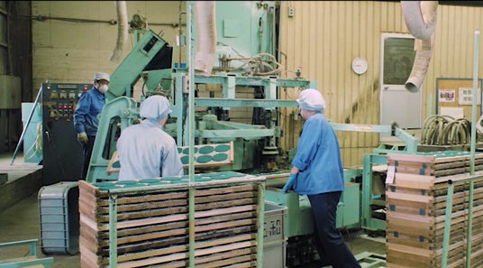 蚊取り線香の製造風景。1943年の発明以来、修繕を重ねながら現在も稼働を続けている。