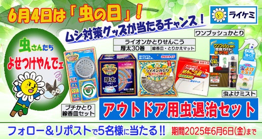 殺虫・防虫剤メーカーである当社にとっても特別な意味を持つこの日、蚊取り線香をはじめとする家庭用殺虫剤で快適な夏を過ごしてほしいという思いから、「アウトドア用虫退治セット」を抽選でプレゼントする「虫の日 アウトドア用虫退治セットプレゼントキャンペーン」を、2025年6月4日(水)~6日(金)に実施します。