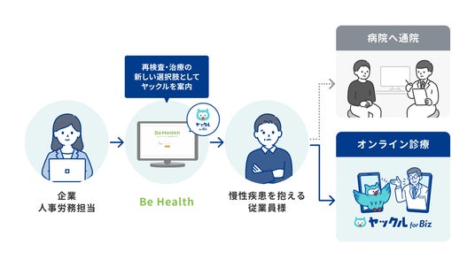 両社がそれぞれ強みとする事業・サービスや顧客基盤は補完関係にあり、本業務提携によって双方のサービスの充実および顧客の拡大を図ります。具体的には、弊社が提供する健康管理システム「Be Health」の受診勧奨通知画面からヤックル社のオンライン保険診療を受診できる動線を確保することで、受診勧奨対象者が速やかに受診しやすい環境を提供し、健康経営(R)に取り組む顧客へ医療機関受診率の向上を価値として提供することを目指します。