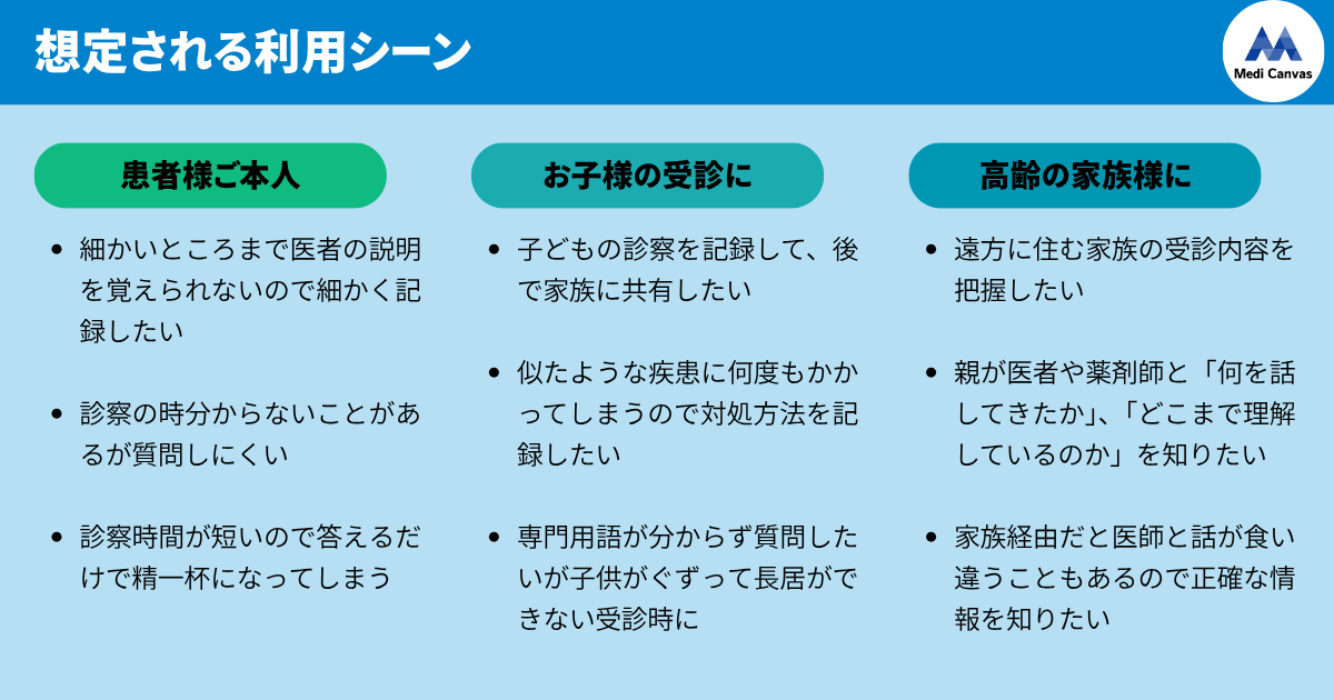 また、高齢の家族の通院に付き添えない、子どもの受診中に話を聞き逃してしまうなど、日常の中で診察内容を後から思い出せない場面は少なくありません。「よりそい」は、こうした身近な悩みから生まれたサービスです。