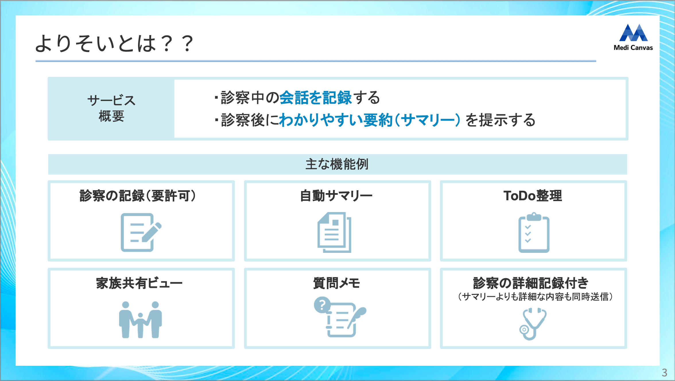 株式会社メディキャンバス(所在地:大阪府大阪市北区梅田1-2-2 大阪駅前第2ビル12-12、代表取締役:副田渓)は、2025年10月17日に、診察中の会話をAIが自動で要約し、患者や家族が後から簡単に振り返れる新サービス「よりそい」のプロトタイプ版を公開しました。