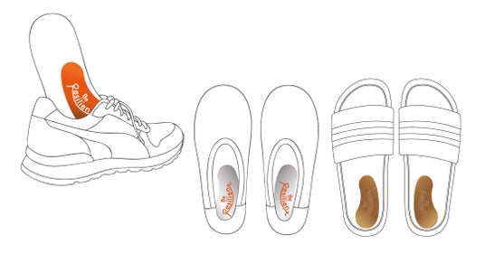 シリコン仕上げで滑らない「ビーレジシートPro」は室内履き使用やインソールの無い履物にも対応できるため、シーンを選ばず使用可能。履物に貼るだけなので、サイズ調整も無く、どんな履物にも使えます。