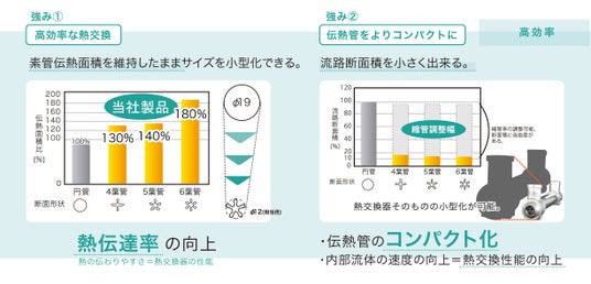 本製品は、当社の独自技術である『多葉状伝熱管SCFチューブ』により、「熱効率の向上、小型化、熱膨張による歪みの防止」のほか、省エネや省スペースを実現いたします。