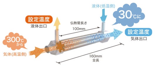 円管に比べて伝熱面積が広く、内周側に高温流体を流せる構造で、わずか100mmの伝熱管でも300℃のガスを30℃以下に急冷できます。(空気流量が5NL/minの場合 ※2)