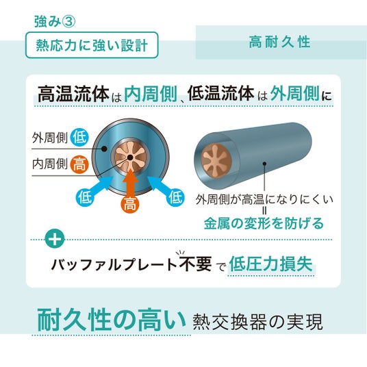 多葉状のチューブにより、同じサイズの円管と比較してより大きな伝熱面積を確保出来ます。