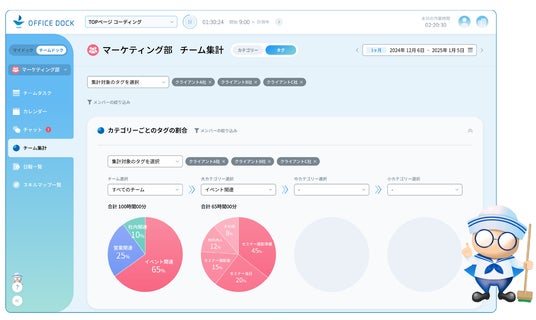 タスク管理機能と連動し、業務時間を自動集計します。どのプロジェクト、どの業務カテゴリーにどれだけの時間が投下されたかを構造的に把握。「売上-原価(人件費含む)=粗利」の予実管理がリアルタイムで可能となり、勘や経験に頼らないデータドリブンな経営判断を実現します。