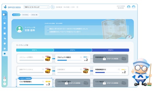 日々のタスク実行結果が、自動的に個人のスキルマップに反映されます。従業員はゲームのレベル上げのような感覚で、自身の現状と目標(次に習得すべきスキル)を直感的に把握可能。上司が細かく指示を出さなくとも、従業員が自ら考え行動する「自走型組織」の構築を促します。