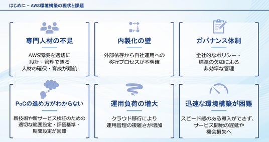 近年、多くの企業にとってクラウド活用、特にAWSの導入はデジタルトランスフォーメーション(DX)推進における重要な要素となっています。しかしながら、「専門人材の不足」「内製化への移行プロセスの不明確さ」「ガバナンス体制の欠如」「新技術検証(PoC)の進め方の困難さ」「運用負荷の増大」といった課題に直面する企業も少なくありません。