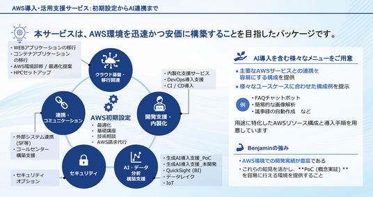 システム開発及びAWS構築支援を手掛ける株式会社ベンジャミン(本社:東京都中央区、代表取締役:川尻 純、以下 ベンジャミン)は、本日より、企業のAmazon Web Services(以下、AWS)導入から運用、さらにはAI活用や新規開発支援までをワンストップで支援する「AWSスタートアップパッケージ」の提供を開始したことをお知らせいたします。