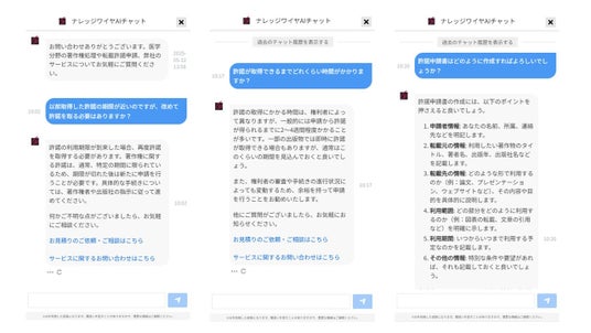 本チャットボットは、24時間365日ご利用いただけ、場所や時間を選ばずにアクセス可能です。これにより、業務の合間や急な疑問が生じた際にも、すぐに情報にアクセスできる利便性を提供いたします。また、専門用語についても分かりやすい言葉で説明することを心がけており、著作権・転載許諾処理に関する専門知識をお持ちでない方でも、安心してご利用いただけるよう配慮しております。