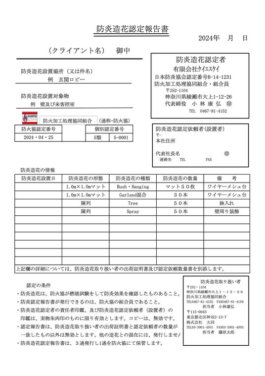 購入後に防炎造花認定報告書の発行が可能。安全性が求められる空間でも安心してご利用いただけます。