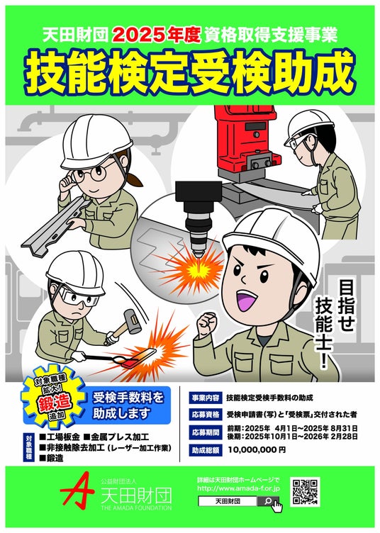 公益財団法人天田財団(神奈川県伊勢原市、代表理事理事長:伊藤 克英)は、金属等の加工に関する技能検定の受検手数料の助成を行っており、2025年度前期の申請を8月31日まで募集しています。