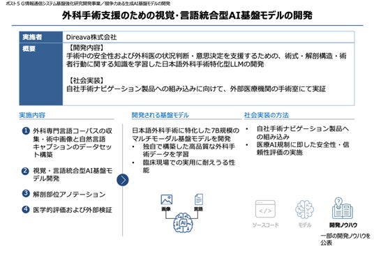 大規模計算資源(GPU)の提供や、生成AI技術の社会実装に向けた支援を通じて、国産AIエコシステムの育成を図っています。計算資源提供ではこれまで、2024年2月から第1期、2024年10月から第2期の支援を実施しており、2025年3月から開始された第3期の公募においてDireavaの「外科手術支援のための視覚・言語統合型AI基盤モデルの開発」が採択されました。