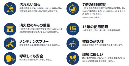ファイヤーショーカスティックは従来の消火器と異なり消火剤は出さず、人体に無害な不活性化ガスを100秒間噴射する事により酸素を枯渇させて消火する新世代の消火具です。パソコンなどの精密機器を壊さず、大事なものも汚さずに初期消火ができます。人体にも無害で、お子様やペットが居るご家庭でも安心して利用できます。