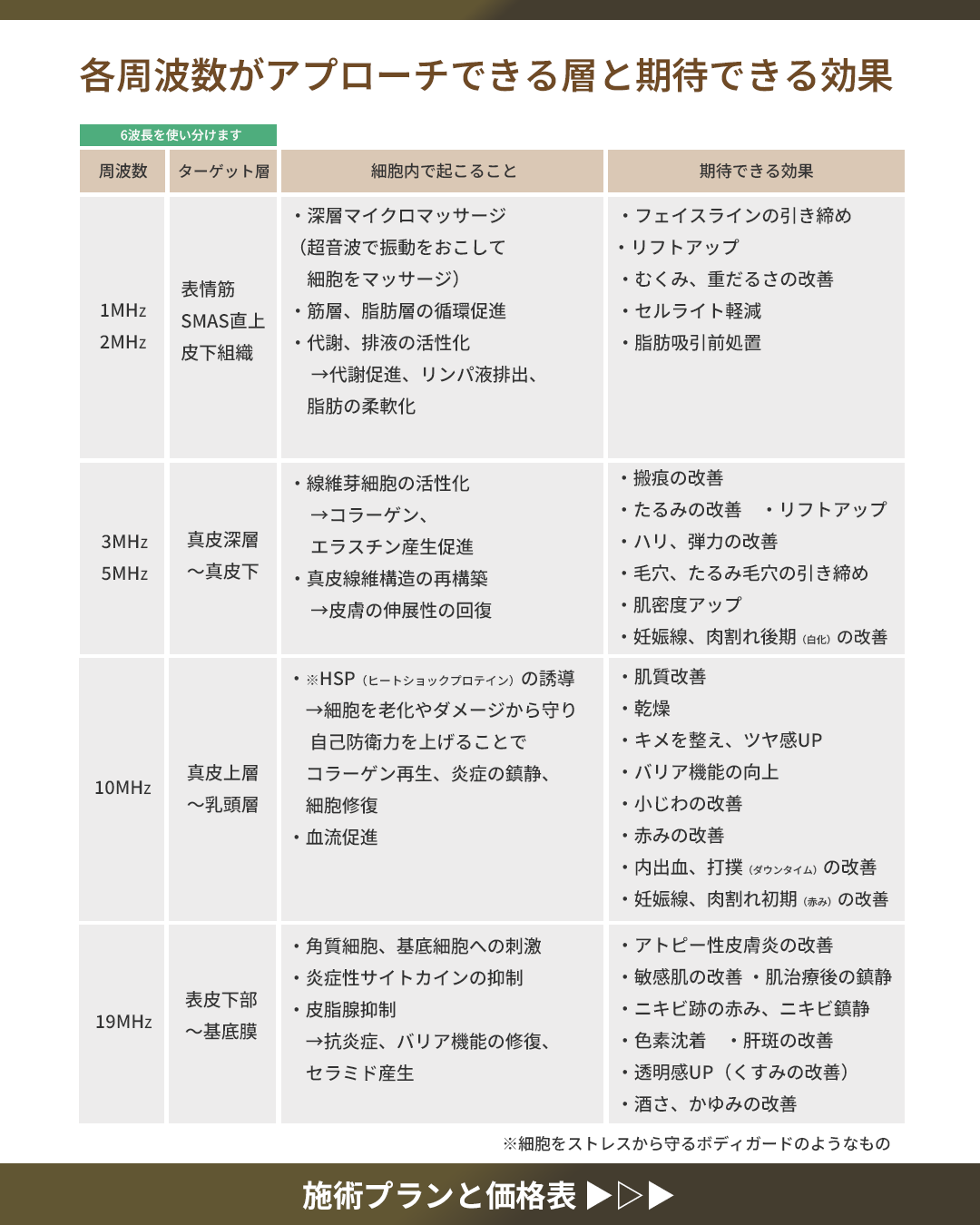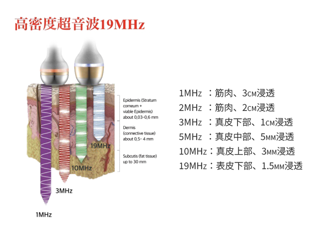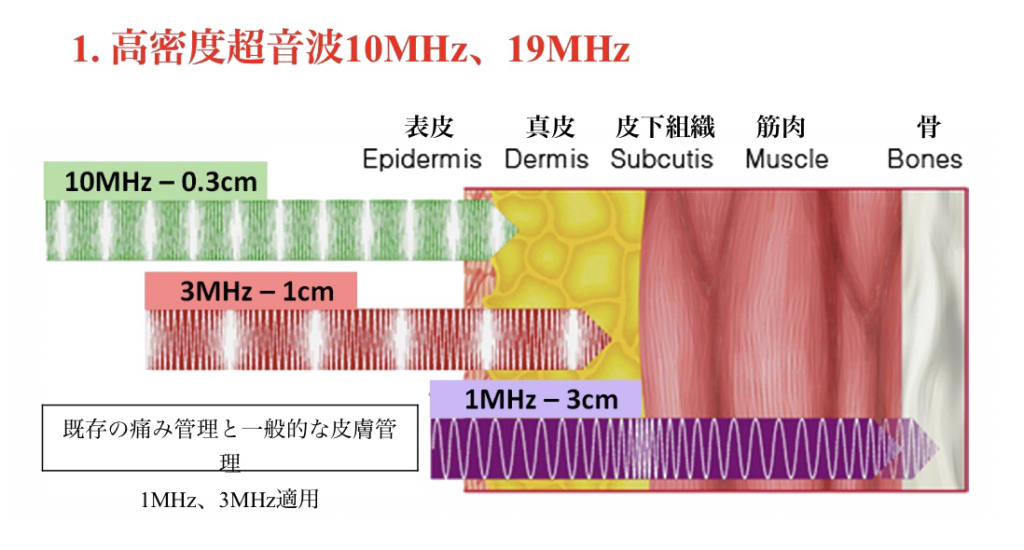 1つのブローべから最大4つの周波数を高速で切り替えることで、肌の深部に振動エネルギーを届け、細胞の再生と修復を促す医療用高密度超音波機器です。