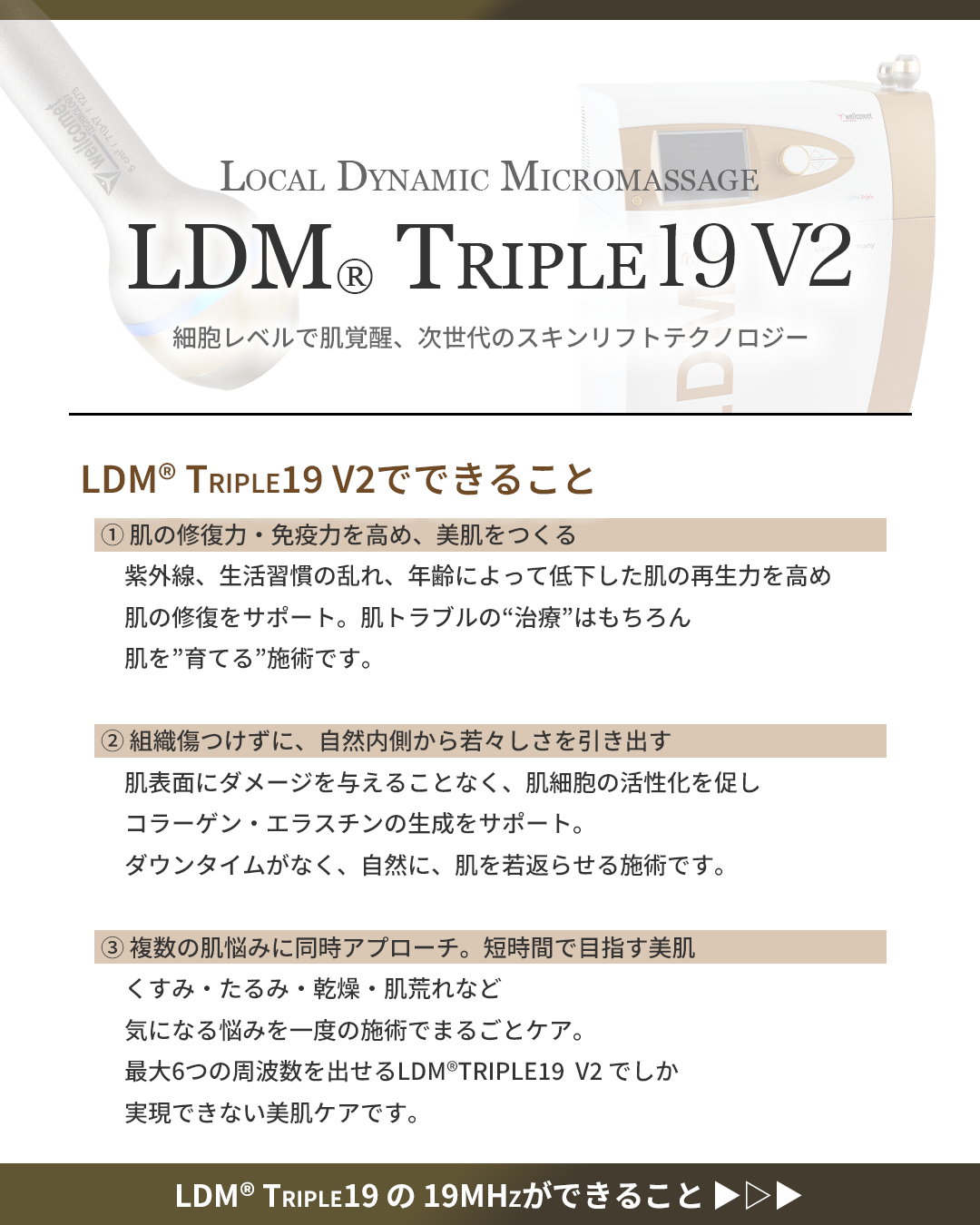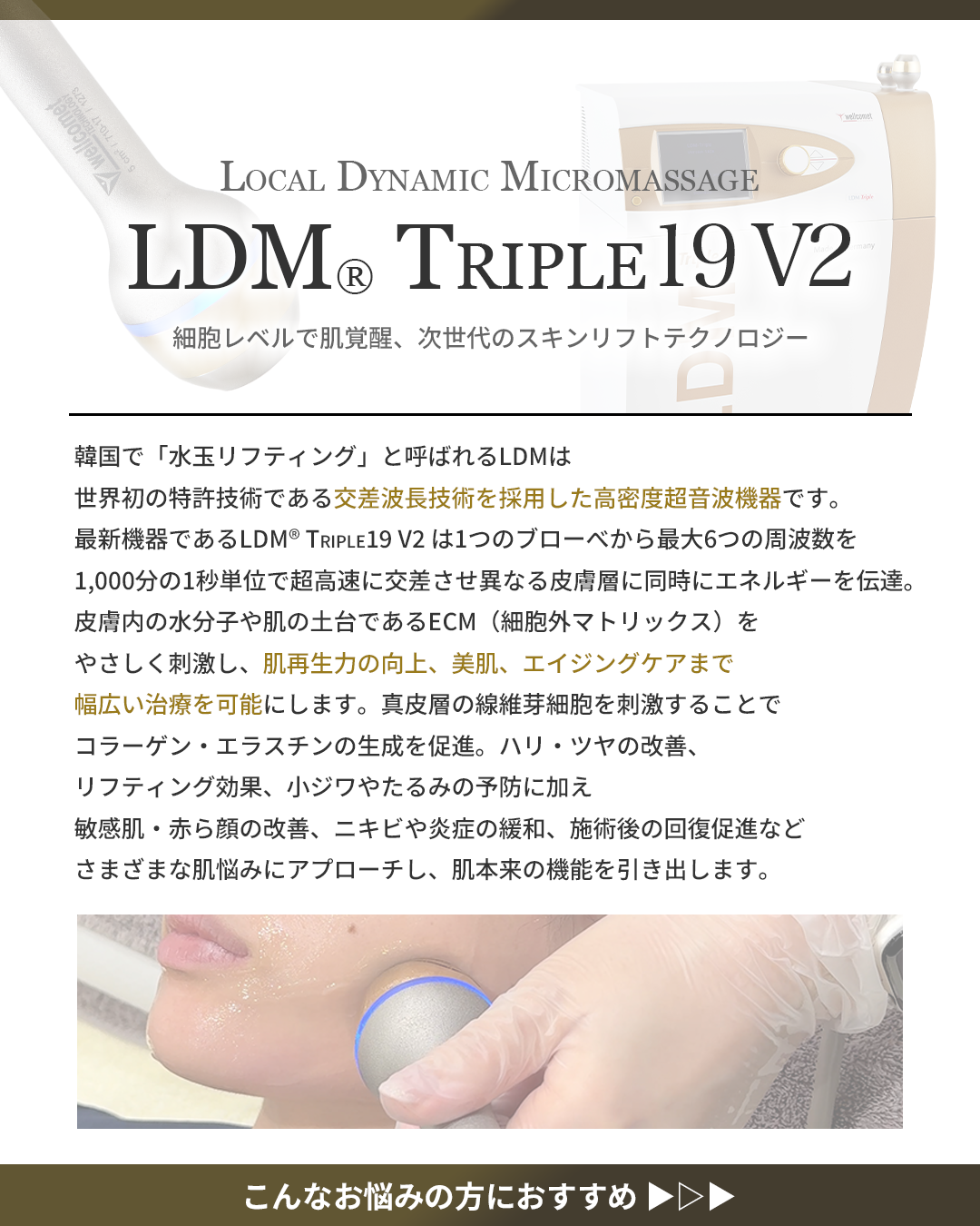 LDM(R)はドイツwellcomet社が開発した、世界初の特許技術である交差波長技術を採用した高密度超音波機器で、肌細胞を活性化し自然治癒力を高める“Local Dynamic Micromassage”テクノロジーを採用。