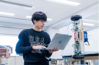 ロボット開発・AI制御・IoT技術など、電子工学の基礎から最先端応用まで幅広く学ぶ学科です。創立以来、“人と技の両立”を教育理念とし、社会課題の解決に挑むエンジニアを育成しています。