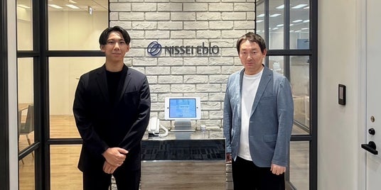 ニッセイエブロ株式会社のオフィスにて。同社 代表取締役社長 亀田氏(右)と、Arks Japan株式会社 代表取締役社長 坂本(左)。