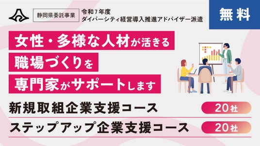 静岡県は、企業における女性・高齢者・外国人など多様な人材が、その能力を十分に発揮できる職場づくりを支援する「ダイバーシティ経営導入推進アドバイザー派遣事業」を開始、6月25日(水)より申込受付スタートをいたします。