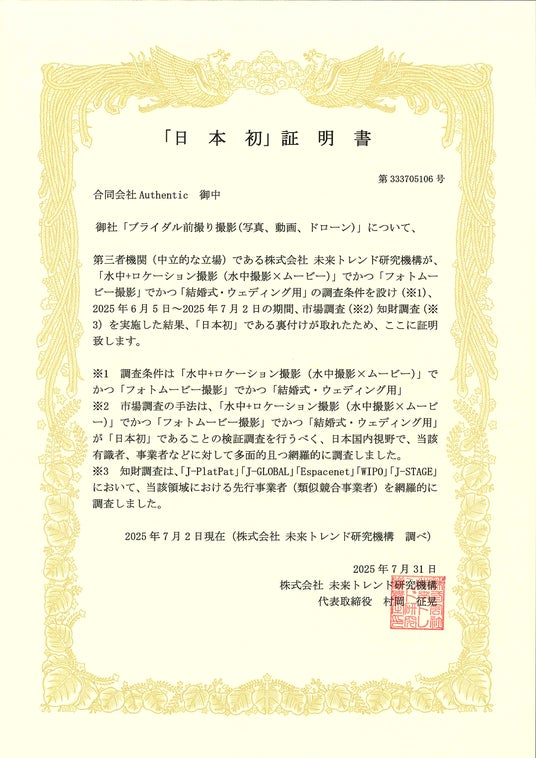 今回の認定は、第三者機関である株式会社未来トレンド研究機構が2025年6月5日~7月2日に実施した、市場・知財調査によるものです。調査条件は「水中+ロケーション撮影(水中撮影×ムービー)+フォトムービー撮影」かつ「結婚式・ウェディング用途」。全国規模での市場調査に加え、特許・知財データベース(J-PlatPat、WIPO等)を活用し、国内外の先行事例を徹底的に確認。その結果、同条件を満たすサービスは他に存在せず、SOI WEDDINGが「日本初」と結論づけられました。