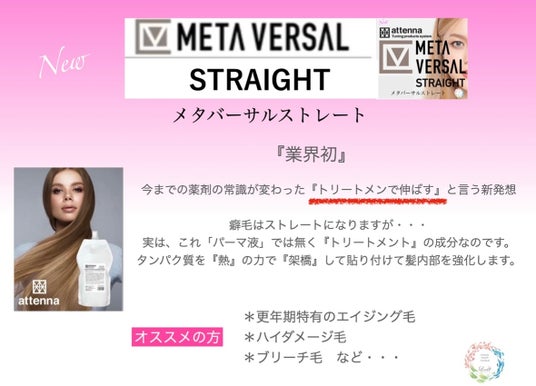 「メタバーサル矯正」は特許成分を含むトリートメント成分をベースにしたノンアルカリ処方の新商材です。傷んだ部分に反応して補修(架橋)しながら、自然な仕上がりのストレートへと導きます。
